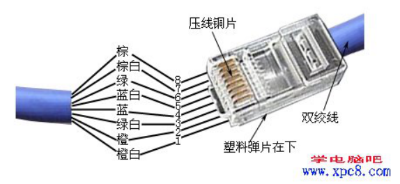 将水晶头的尾巴向下,从左至右,分别定为12345678以下是各口线的分布,水晶头平的一面向上,簧片向下,有线的一端向着自己,这时候从左到右就是18顺序。